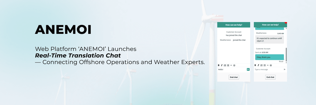Today, Weathernews launches real-time translation chat functionality on the ANEMOI platform, connecting offshore operations directly with weather experts across language barriers.
