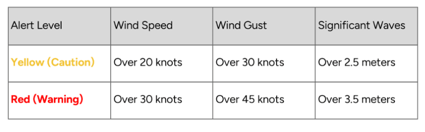 Wind: Wind speeds remain near the Yellow Caution threshold throughout the period, generally ranging between 18–24 kts.
