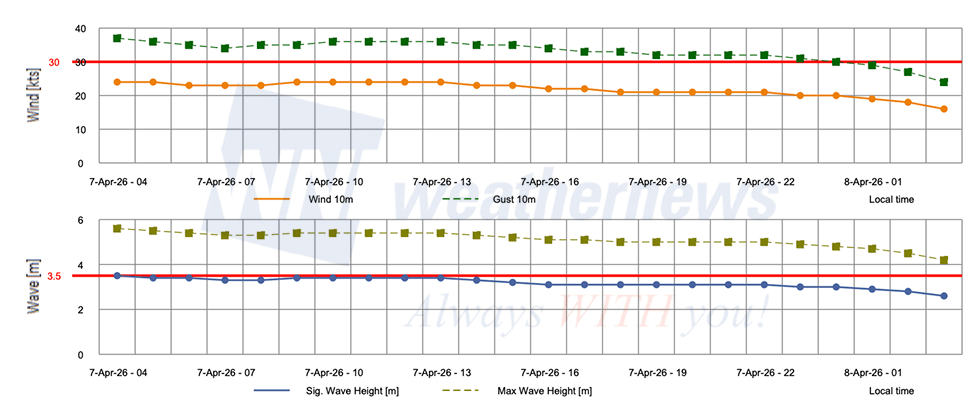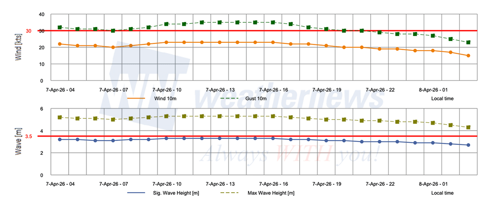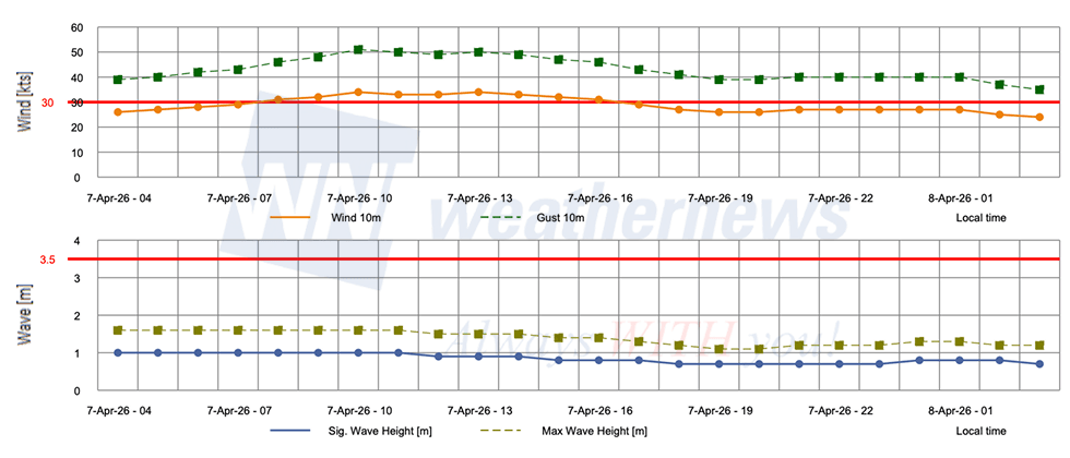 Wind: Winds are forecast to exceed the Red Warning threshold (> 30 kts) between 08:00 and 16:00 LT on April 7, 2026, peaking at approximately 33 kts.