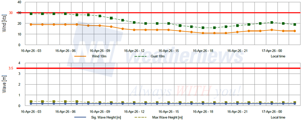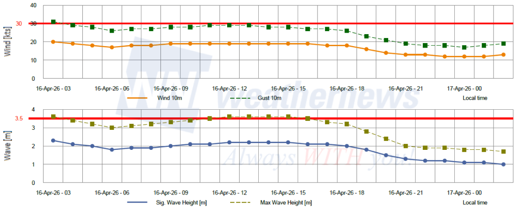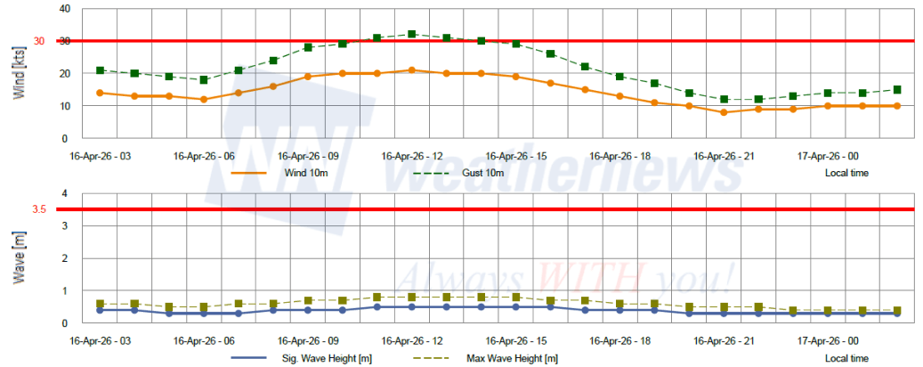 Gust: Wind gusts briefly touch the Yellow Caution threshold (30-31 kts) at 03:00 LT on April 16. Gusts stay near 28-29 kts through the afternoon before weakening significantly after 18:00 LT.