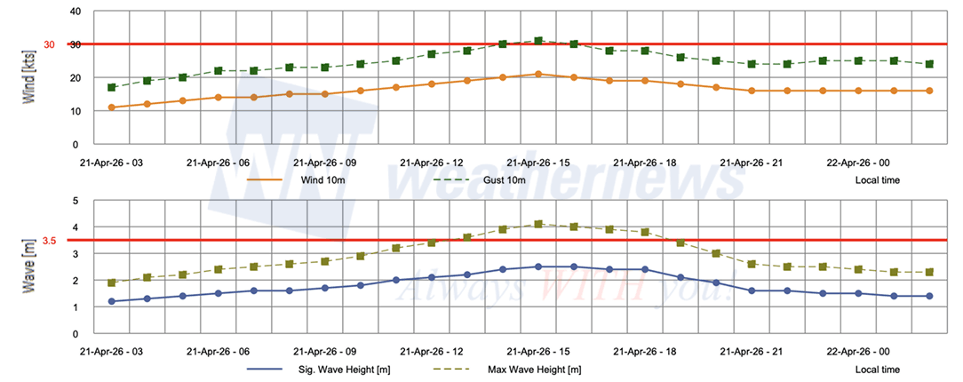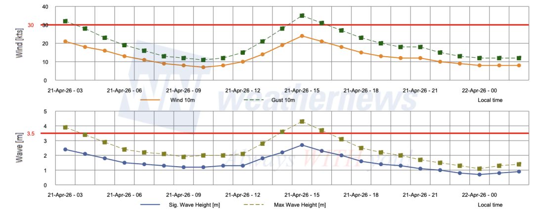 The primary weather concern for Al Shaheen Terminal is a sharp but short-lived peak in wind, gust, and wave conditions around 15:00-16:00 LT on April 21, 2026.